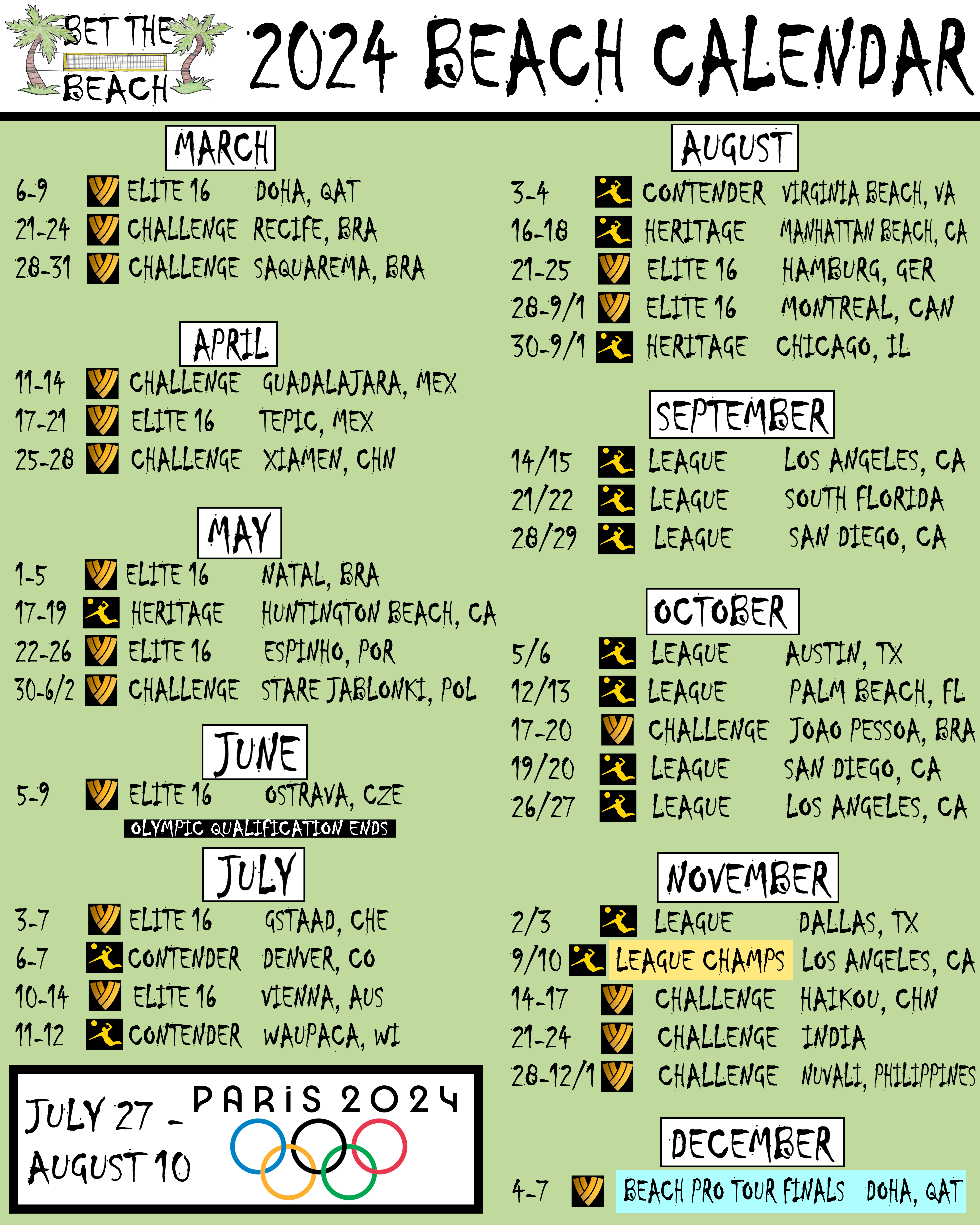 There it is. It’s a beautiful, beautiful thing. The 2024 Beach Volleyball Calendar, in all its glory. The long, sad, cold offseason is almost over, the 2024 beach volleyball season is almost here. 15 days stand between us and a huge year for the sport. Let’s break it down, by the numbers.