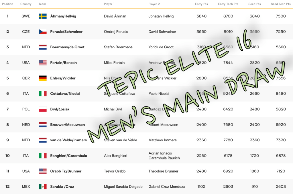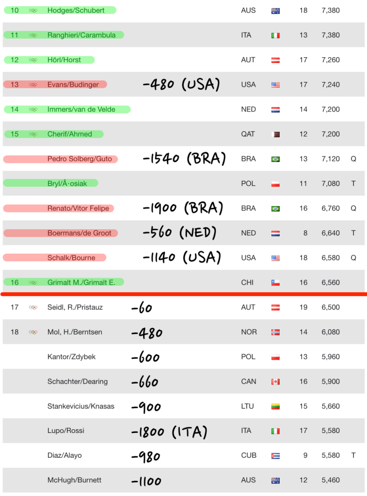 Taking a closer look at the men’s Olympic bubble, we see that Evans and Budinger have currently the 15th most points on tour, and lead the last team in, Chile’s Grimalt and Grimalt, by 680 points. They would be the first in a list of five men’s teams that fall victim to the harsh rule of the Country Quota.