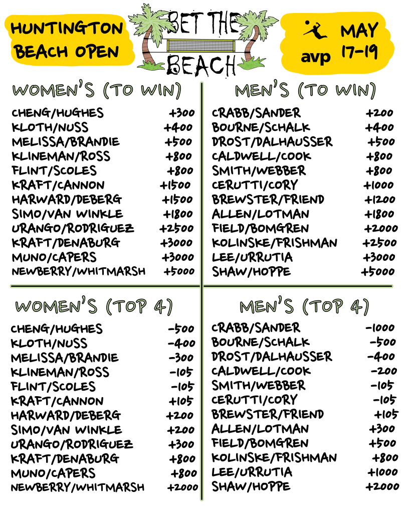 On the women’s side, I’ll be VERY interested to see how Alix Klineman and April Ross look, making their return to the sand as a team for the first time since winning AVP Chicago in fall of 2021. I think they’re a good option to double up your money at -105 to finish top 4. Long shots are tough, since the field is so strong, but I wouldn’t be afraid to sprinkle a bit on Hailey Harward and Kylie Deberg at +200 to finish top 4 as well.