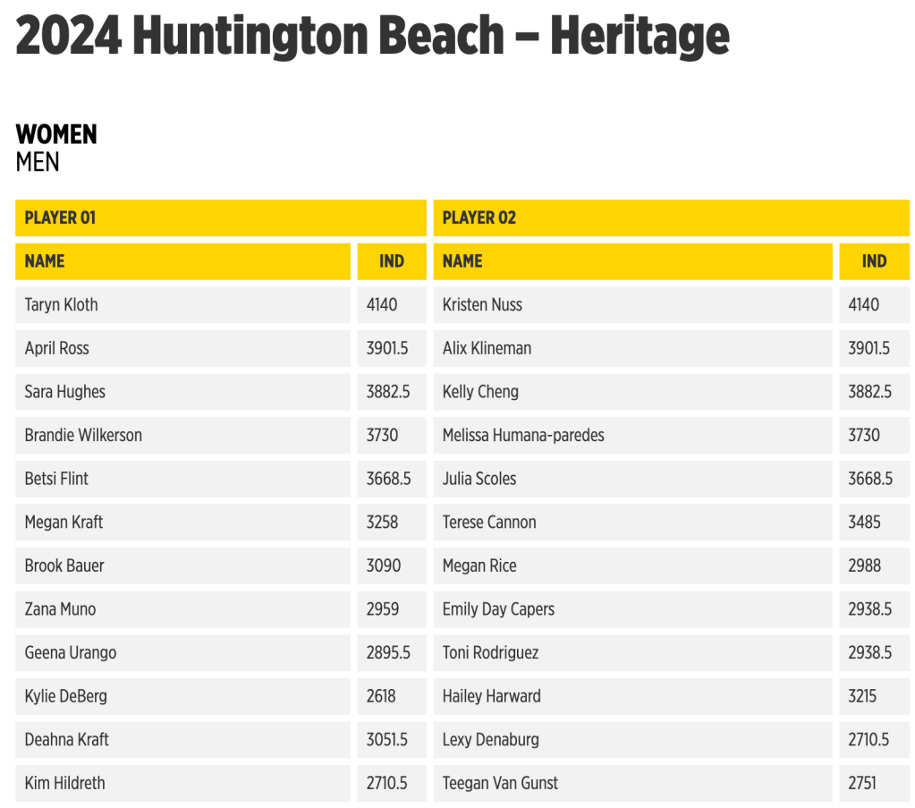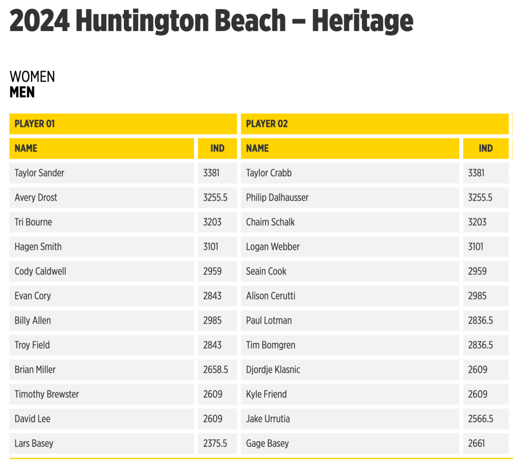 Notably absent on the men’s side are the three men’s teams vying for the 2024 Olympics in Paris later this summer. Miles Partain and Andy Benesh, having already locked up an Olympic spot, dropped off the list a few weeks ago, likely looking for more rest prior to the final two Elite 16’s of the year in Espinho and Ostrava.
