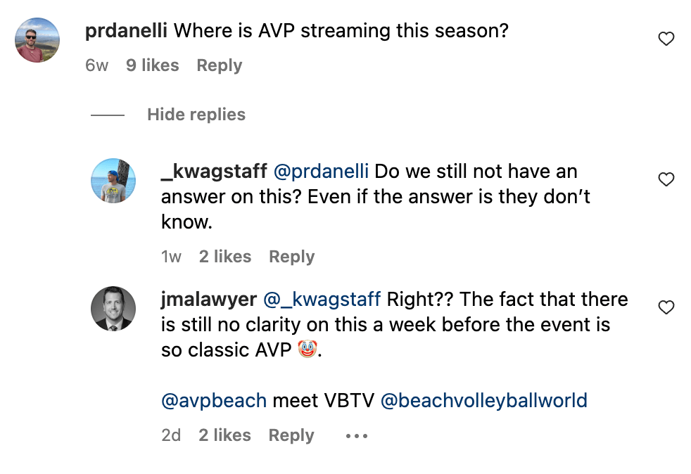 Last year, I was very critical of the AVP when, during the Manhattan Beach Open, the finals were broadcast on ESPN2. Having already downloaded Ballys Live and paid for an ESPN+ subscription, the AVP then switched to ESPN2 for the finals, forcing us into a YouTube TV subscription to see Taylor and Taylor win it all. Not ideal to force your fans into three different platforms and pay out in two different places to consume your content.
