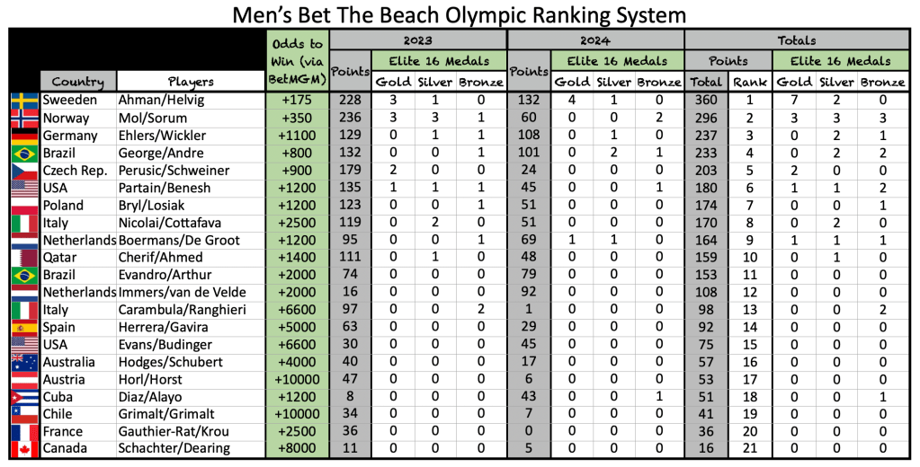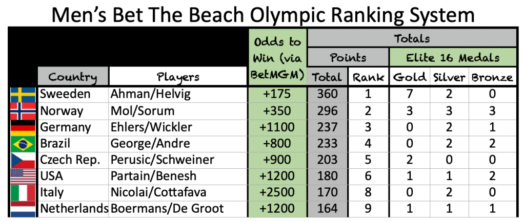 Make sure to join us tomorrow for Bet The Beach Live, 9p ET, 6p PT on our YouTube channel. We’ll dive deeper into the odds to win, recap Gstaad, recap the qualifiers from Vienna (started earlier today), and a whole lot more.