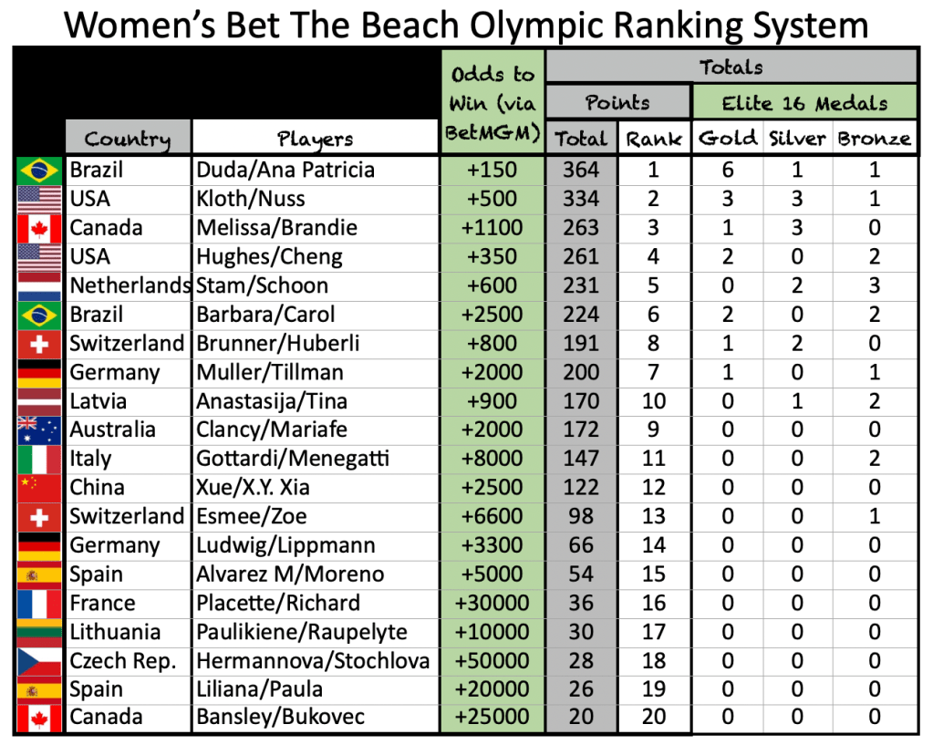 Last week, in our Olympic MEGA BLOG PART 1, we did a deep dive into the men’s odds to win gold in Paris. This week, we turn our attention to the women’s side. Similar to the men, there’s one team (Brazil’s Duda Lisboa and Ana Patricia Ramos) that the books consider to be a fairly heavy favorite at +150 to stand atop the podium come August 9th. However, unlike the men’s side, which only has 3 teams at less than +1000, the women’s side is a bit more top heavy, with 6 teams at +900 or better to win Gold. Let’s dig in and take a look at the numbers.