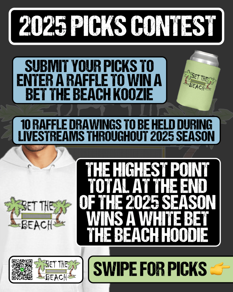 If you’ve made it this far, you’re only a few clicks away from sweet sweet free Bet The Beach MERCH! Go ahead and make your picks below. All entrants will automatically be entered in a raffle to win Bet The Beach Koozies (pictured above). We’ll do a minimum of ten drawings during livestreams throughout the 2025 season and contact all the winners via e-mail or DM. The contest winner is the entrant with the most points accumulated at the end of the 2025 season. Contest winner (or winners in the event of a tie) will win a white Bet The Beach Hoodie (pictured above). Entry deadline is Tuesday, April 1st at 12:00PM.