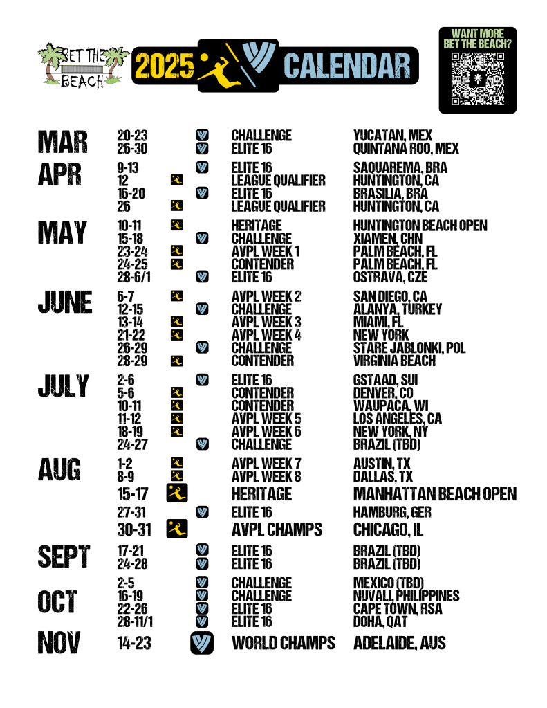 It didn’t take long for the Bet The Beach combined 2025 calendar to need some updating. With the Beach Pro Tour announcing some schedule changes late last week, and some more clarity from the AVP on the league qualification events, an update was necessary.